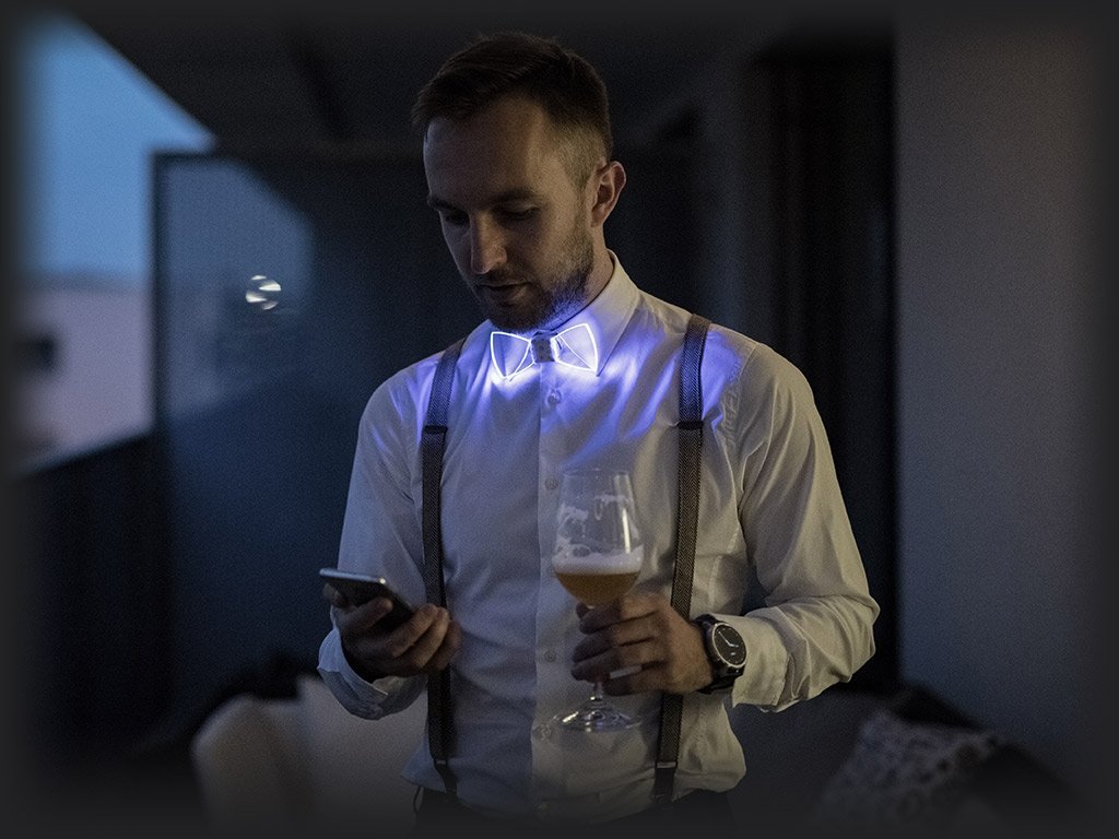 New and refined shape of our most classical bow tie. Holo stands out with its holographic effect in 13 colours. Just push a button on the remote control.
